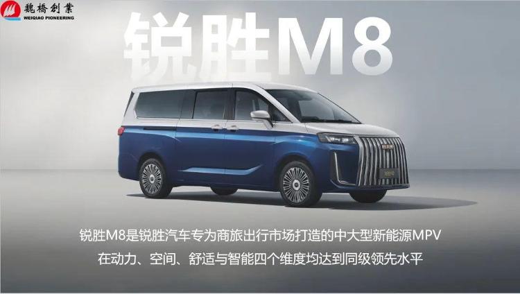 锐胜M8:锐胜M8是魏桥汽车科技旗下锐胜品牌专为商旅出行市场打造的一款中大型新能源MPV车型。该车型能够充分满足用户在高规格客运、商务接待及休闲旅行等多种场景下的需求,并在动力性能、座舱空间、驾乘舒适性与智能化配置四个维度均达到同级别领先水平。