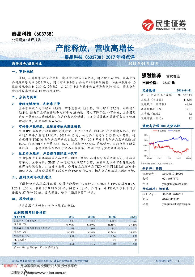 民生证券-泰晶科技-603738-2017年报点评:产能释放营收高增长-180412